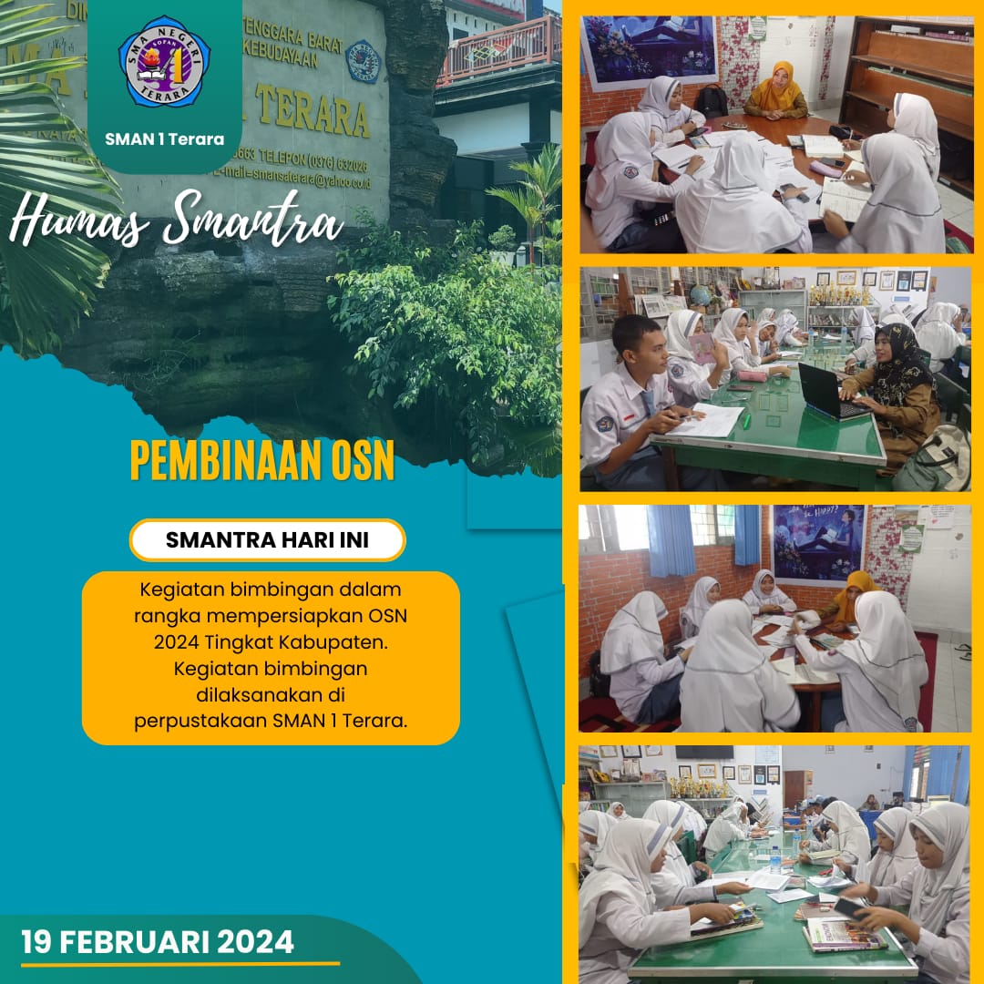Lombok Timur–OSN merupakan sebuah ajang talenta di bidang Sains yang diselenggarakan untuk peserta didik. Ajang OSN diselenggarakan secara bertingkat mulai dari daerah hingga nasional. Tercatat sebanyak 45 peserta didik SMAN 1 Terara mengikuti pembinaan. Sementara, pembina tercatat sebanyak 9 guru. Ada pun bidang lomba pada OSN yakni matematika, biologi, kimia, fisika, geografi, kebumian, informatika, astronomi, dan ekonomi.Senin, ( 26/02)