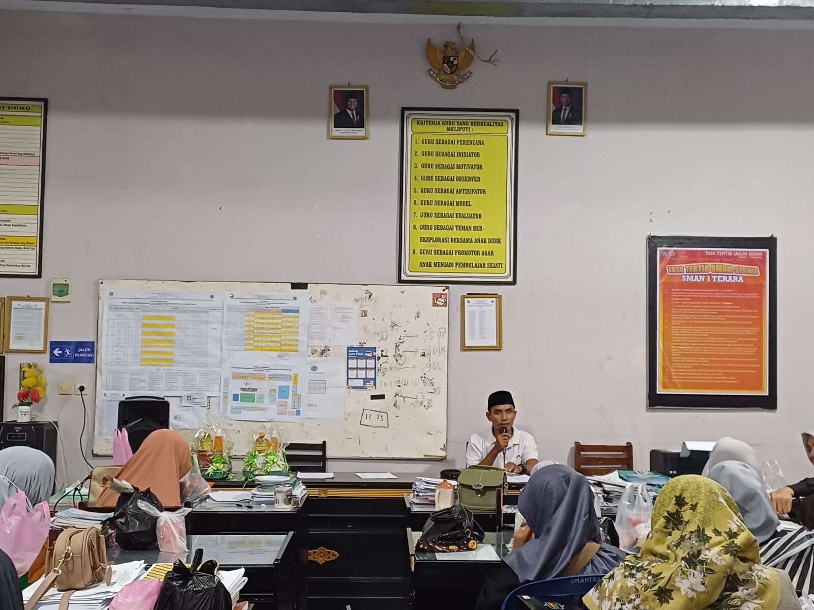 H. Lalu Muhammad Thayib memimpin kegiatan rapat tersebut. Dalam sambutnya menyampaikan empat poin pembahasan. Pertama, kegiatan bazar dan berbagi takjil yang telah suskses dilaksanakan. Dua, terkait jumlah kelulusan siswa/i SMAN 1 Terara yang lulus SNBP tahun 2025 tercatat sebanyak 27 siswa. Tiga, pelaksanaan STS dan PAT selama delapan hari dilangsungkan berjalan dengan lancar. Empat, sehubungan dengan kegiatan ujian sekolah ( US) bagi kelas XII dilaksanakan pada bulan April. Jelasnya wakasek bidang humas ini.